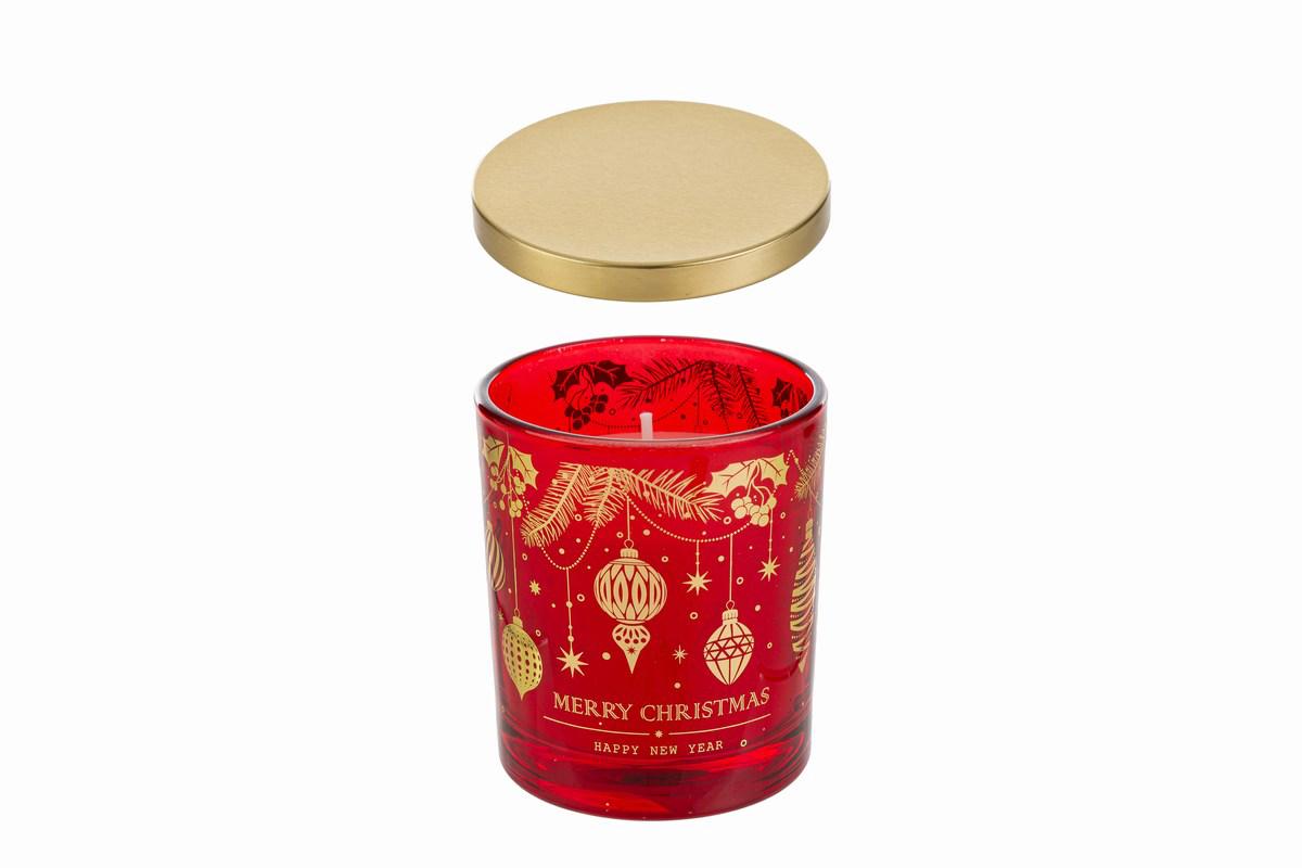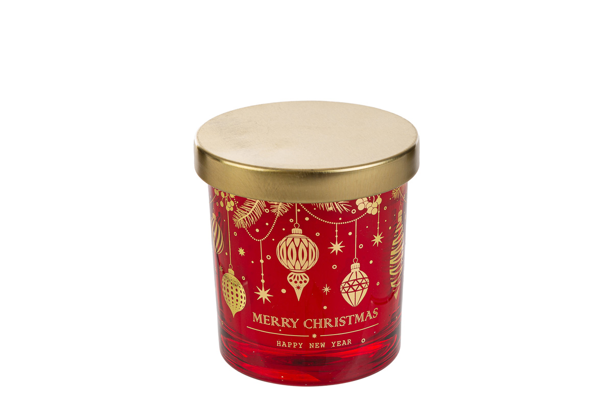 candela profumata con barattolo riutilizzabile in vetro colore rosso e dettagli oro by ”le stelle”