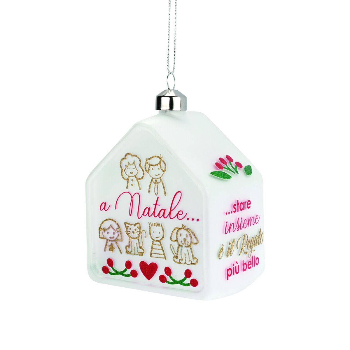 addobbo natalizio in vetro a forma di casetta con frase: “A Natale stare insieme è il regalo più bello”