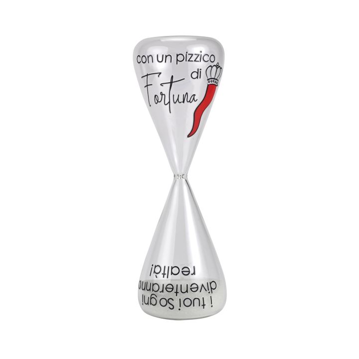 Clessidra in vetro borosilicato Con sabbia che si dissolve lentamente. Personalizzata con il decoro di un corno e frase buon augurale. Perfetta come bomboniera per tutte le occasioni speciali, questa clessidra aggiunge un tocco di magia e significato a ogni evento