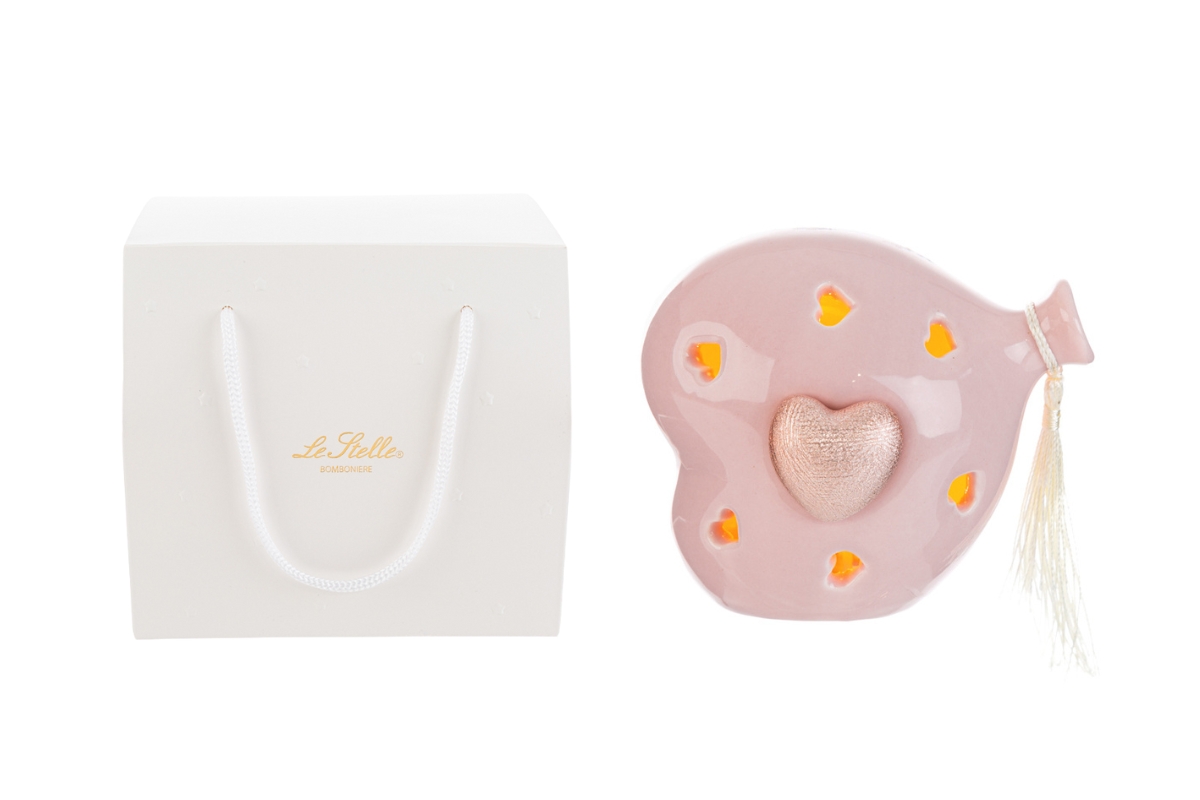 Un raffinato cuore Led rosa a forma di palloncino in porcellana arricchito con un cuoricino satinato e la nappina laterale che dona eleganza e delicatezza. Dimensioni 11x8x11 cm, perfetto come bomboniera per celebrare la gioia di una nuova nascita, il battesimo o il compleanno della vostra piccola. I Milky Colors, tonalità tenui e lattiginose, sono tra i più amati del momento per le decorazioni delle camerette. Completo di shopper abbinata pronta per essere donata.