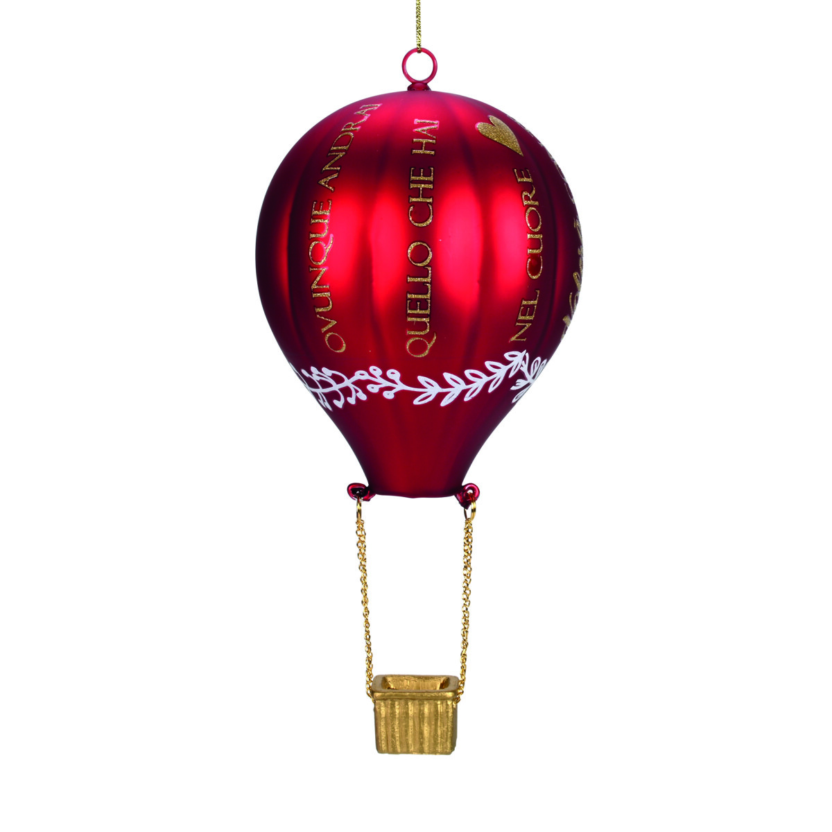 addobbo natalizio in vetro a forma di mongolfiera con frase : “Ovunque andrai quello che hai nel cuore volerà con te”