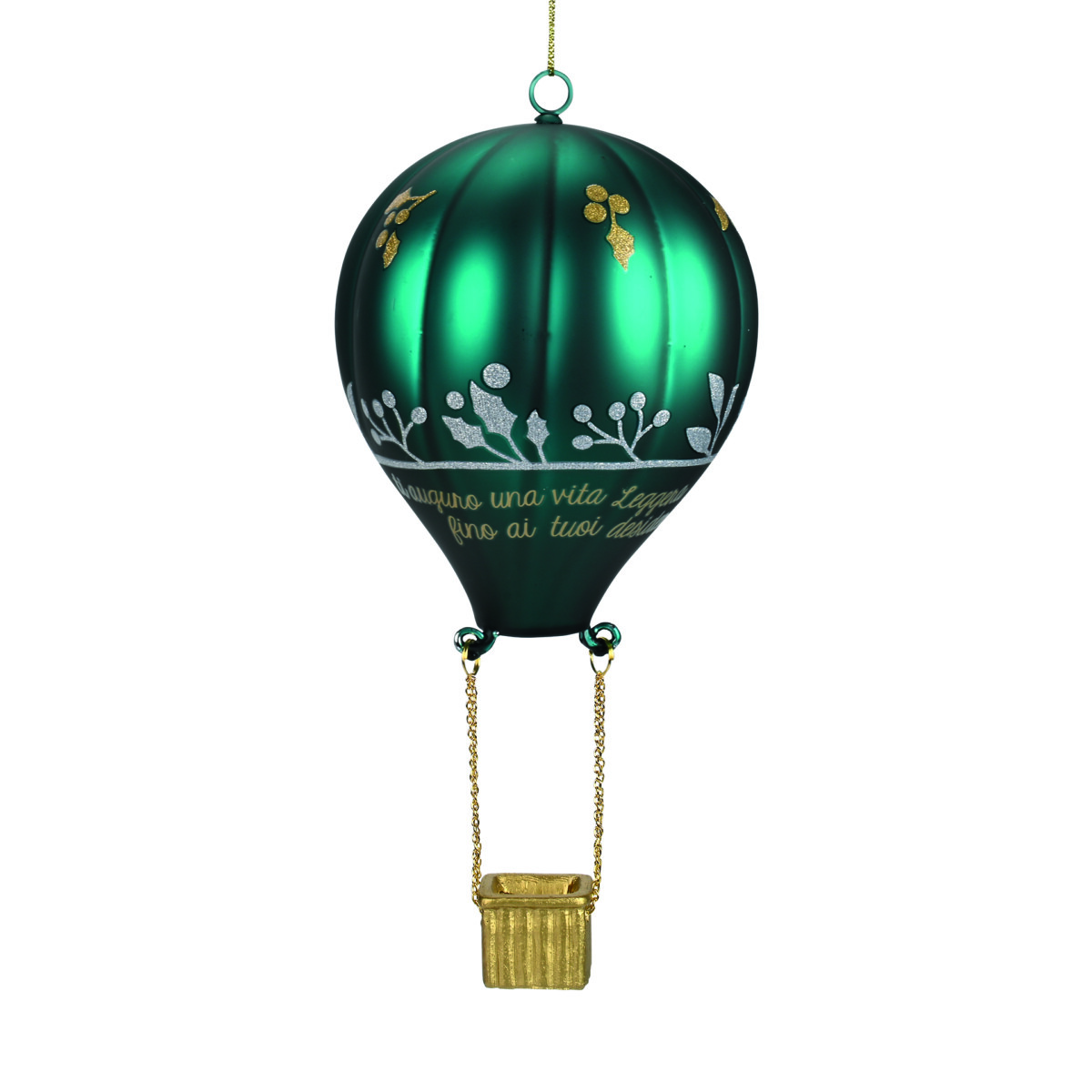 addobbo natalizio in vetro a forma di mongolfiera con frase :”Ti auguro una vita leggera per volare fino ai tuoi desideri”