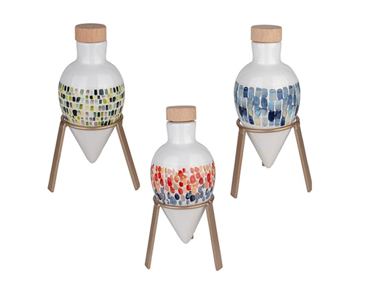 L’Oliera a Goccia con Stand (assortita in 3 colori) firmata Etiemme ridefinisce il concetto di accessorio da tavola, trasformando un contenitore funzionale in una vera e propria piccola scultura. Grazie alla sua particolare struttura sospesa e ai vivaci decori a mosaico, rappresenta una scelta d’avanguardia per chi desidera una bomboniera utile ma dal forte impatto visivo.