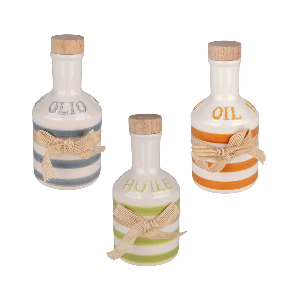Raffinata oliera in ceramica decorata con eleganti righe orizzontali e scritta โHuileโ. Il design รจ impreziosito da un delicato fiocco in garzina che dona un tocco romantico e shabby chic, perfetto per valorizzare la tavola con stile.