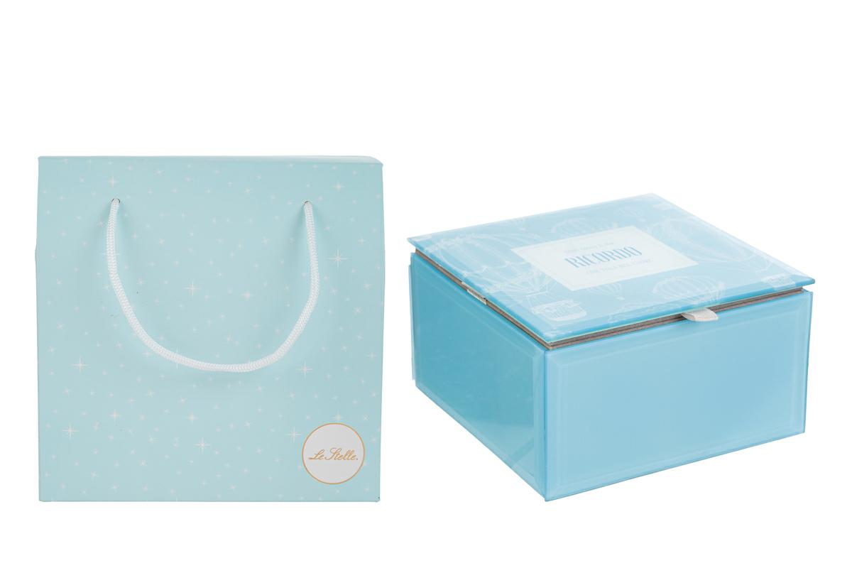 Un piccolo scrigno pensato per custodire non solo gioielli, ma anche emozioni. Questo elegante portagioie in vetro azzurro รจ impreziosito dalla dolce scritta: