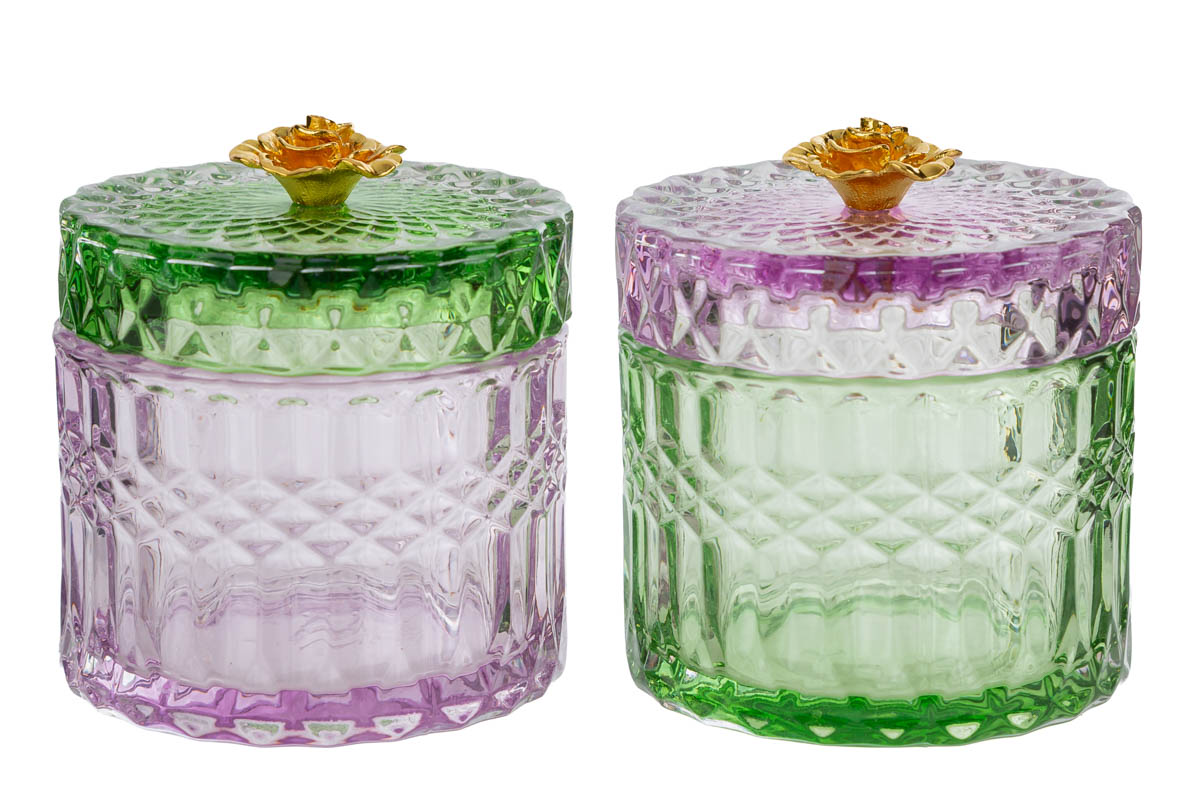 Queste bomboniere in vetro colorato, proposte in due diverse varianti di colore, sono pensate per aggiungere un tocco elegante a un matrimonio. La superficie lavorata e la forma compatta valorizzano la presentazione di confetti o piccoli oggetti. Ogni scatola misura 9,5ย xย 9,5ย xย 10,5ย cm, offrendo uno spazio contenuto ma visivamente ricercato. Il materiale in vetro assicura luminositร  mentre i coperchi decorativi proteggono e valorizzano il contenuto. Ogni confezione รจ curata nei dettagli grafici, rendendola ideale per creare un ricordo di stile in occasione delle nozze.