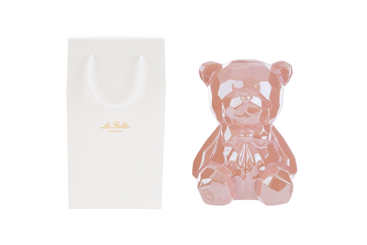 Un tenero salvadanaio in porcellana rosa, perfetto per celebrare momenti speciali. Con le sue dimensioni di 14x13xh.18 cm e un design curato a forma di orsetto, รจ ideale come bomboniera per nuove nascite o battesimi. Completo di shopper coordinata, aggiunge un tocco raffinato e significativo alle tue occasioni importanti.
