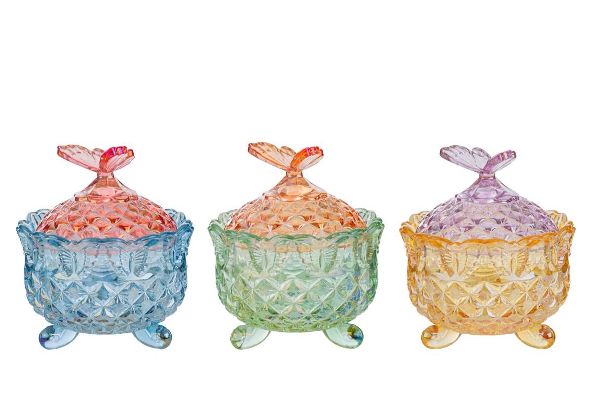 Scatola portagioie in vetro colorato e coperchio con farfalla, in 3 colorazioni assortite