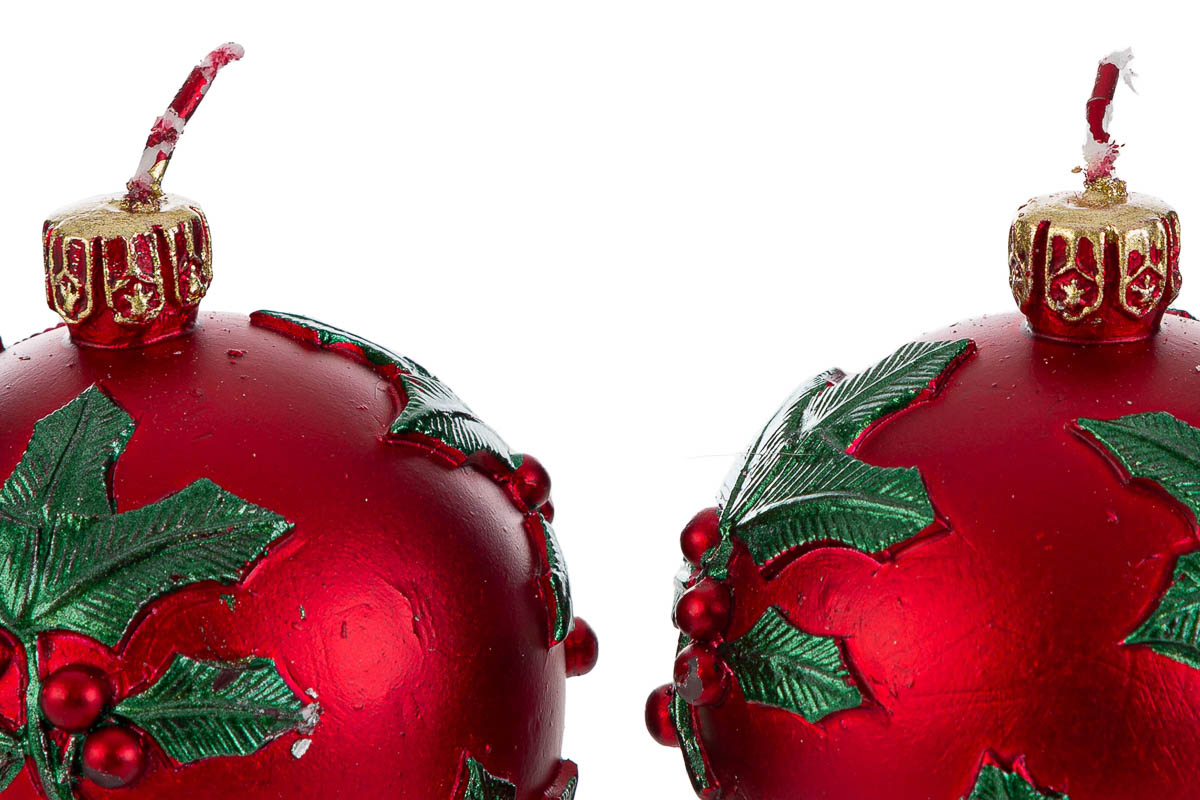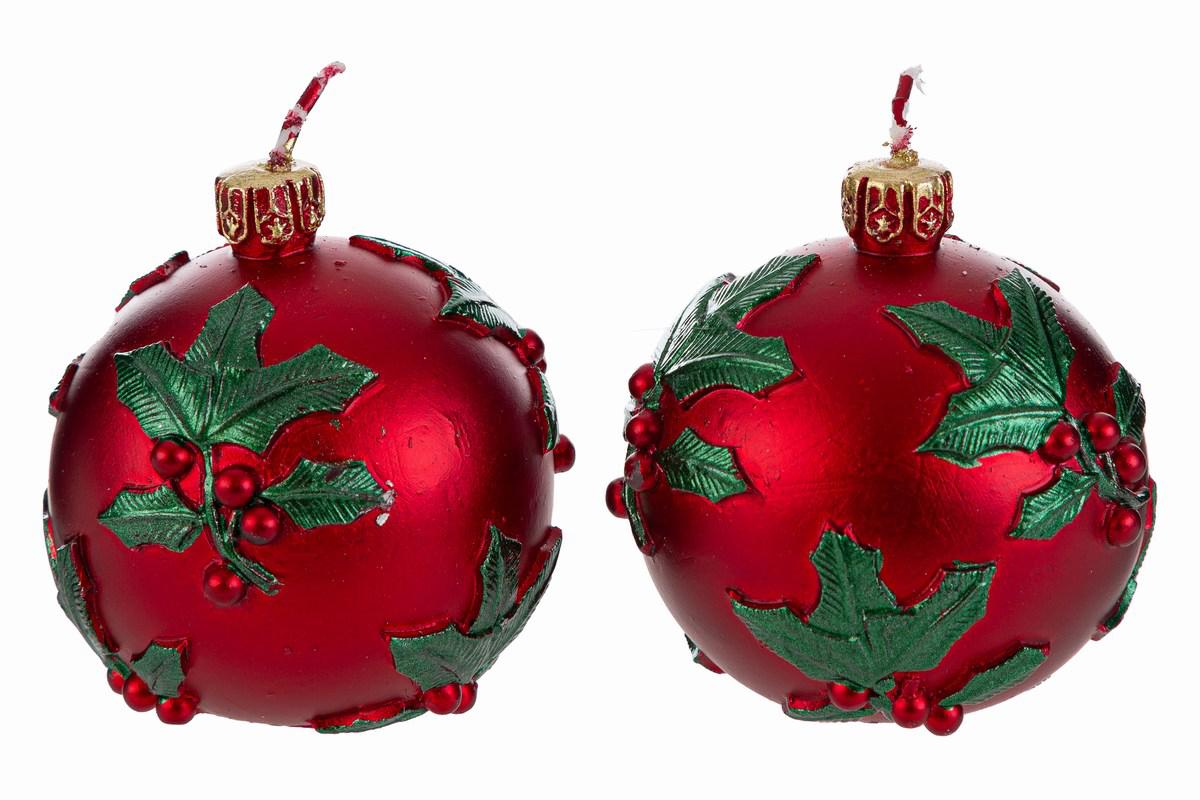 set composto da 2 candele a sfera natalizie di colore rosso con agrifoglio in 3d verde by ”le stelle”