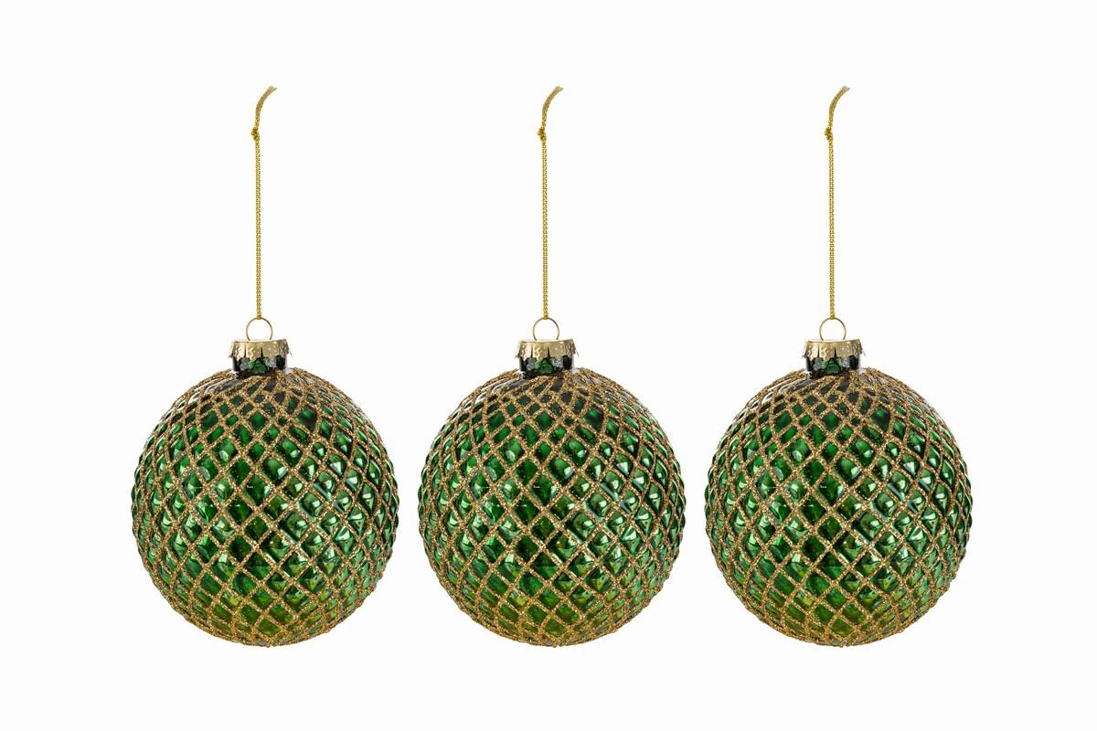 set 3 palline verdi con glitter oro in vetro diametro 8cm
