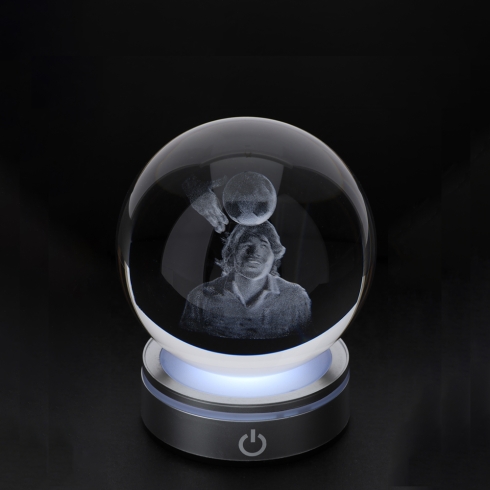 SFERA CALCIATORE: Sfera di Cristallo con disegno in 3D di Maradona inciso a Laser e Base Argento luminosa RGB con differenti funzioni e colori luci.