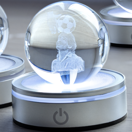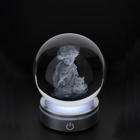 SFERA PRINCE: Sfera di Cristallo con disegno in 3D del Piccolo Principe inciso a Laser e Base Argento luminosa RGB con differenti funzioni e colori luci.